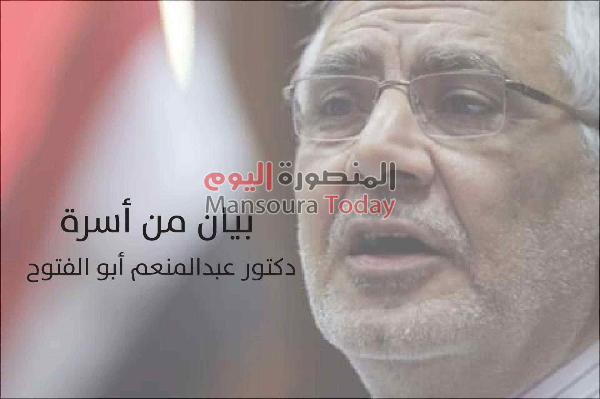 بيان من أسرة الدكتور عبد المنعم أبو الفتوح بشأن البيان الصادر عن وزارة الداخلية