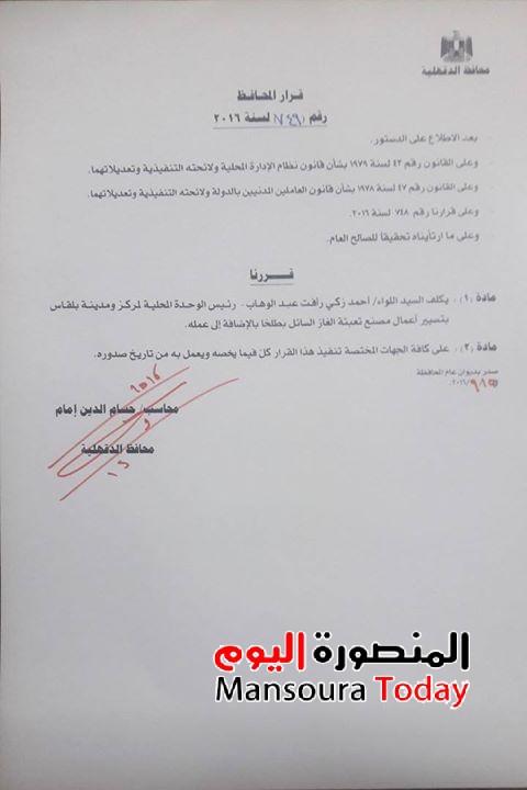 الدقهليةبلقاسعاجل محافظ الدقهلية يصدر قرار بتكليف رئيس مركز بلقاس بتسيير أعمال مصنع تعبئة الغاز السائل بطلخا بالإضافة لعمله الأصلي By On سبتمبر 16, 2016 Share متابعة : احمد حموده اصدر محافظ الدقهلية / حسام الدين إمام القرار رقم (749) لسنة 2016 بشأن تكليف رئيس مركز ومدينة بلقاس اللواء /احمد زكى عبدالوهاب بتسيير أعمال مصنع تعبئة الغاز السائل بطلخا بالإضافة لعمله الأصلي Share FacebookTwitterGoogle+ReddItWhatsAppPinterestالبريد الالكتروني