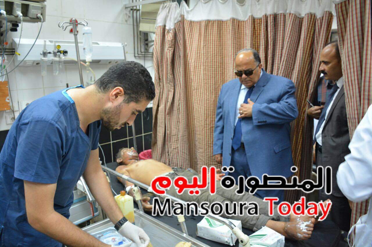تفقد حسام إمام، محافظ الدقهلية، مصابى حادث انفجار ٤ أسطوانات غاز، الذى وقع بأحد المخابز بقرية دنديط مركز ميت غمر،