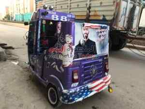 توك توك الزفة مزين بعدد من “الإفيهات” التي رددها الفنان محمد رمضان بمسلسل الاسطورة ومنها” لو عشت جاحد مش هرحم منكو واحد” وعليه صورة للممثلة العالمية الشهيرة مارلين مونرو .