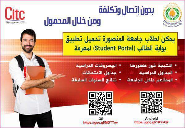 ويمكن الطالب بجامعة المنصورة من تحميل تطبيق بوابة الطالب لمعرفة النتائج قبل ظهورها، المصروفات الدراسية، الجداول الدراسية، جداول الامتحانات، نتائج السنوات السابقة.