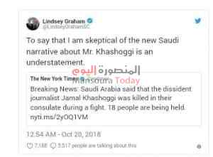حيث اوضح السناتور الجمهوري ليندسي غراهام، الذي يعتبر من أبرز حلفاء ترامب، بالرواية التي قدّمتها السعودية وكتب في تغريدة على تويتر “القول إنّني مشكّك في الرواية السعودية الجديدة حول خاشقجي لا يفي شعوري حقّه”.
