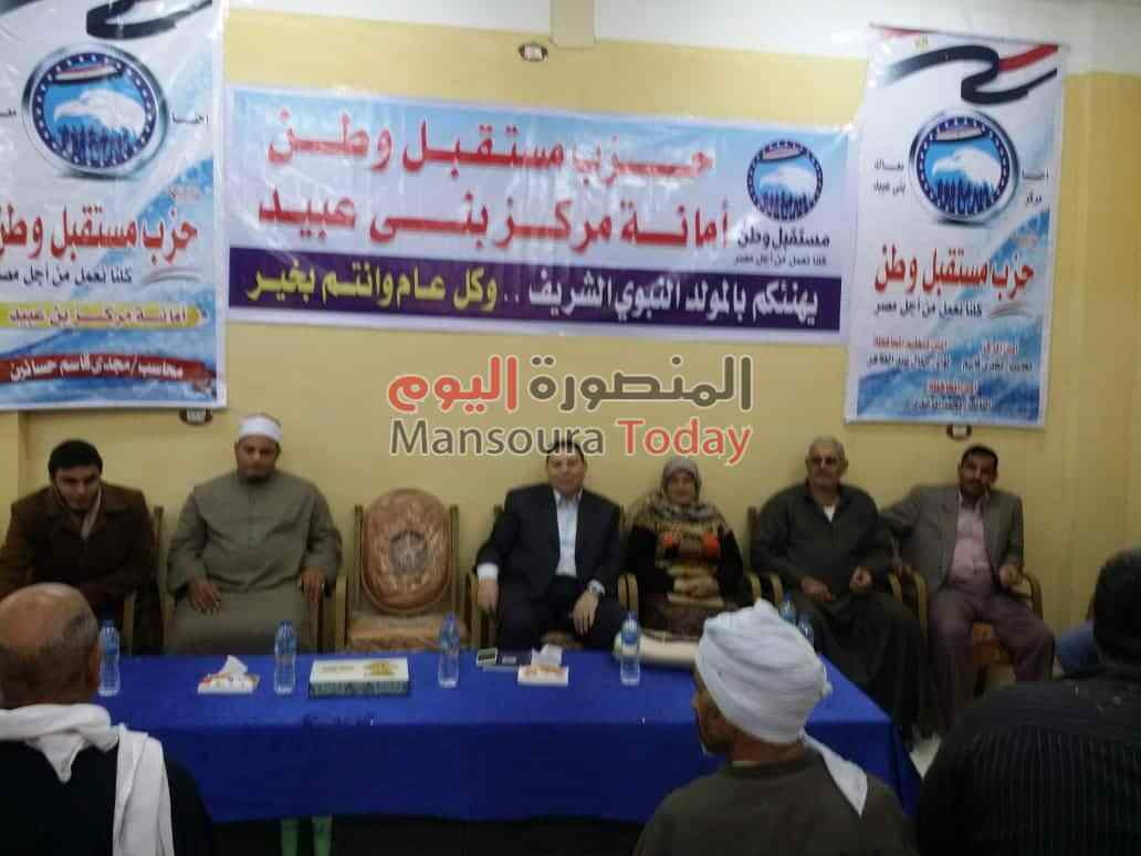 ام حزب مستقبل وطن أمانة مركز ومدينة بنى عبيد برئاسة مجدى قاسم حسانين ، وذلك تحت رعاية النائب محمد المرشدى امين الحزب بمحافظة الدقهليه و اللواء جمال عبد الظاهر امين التنظيم وامناء الحزب ببني عبيد باقامة حفل للمولد النبوى الشريف و تضمن الحفل توزيع ٢٥٠بطانية على الغير قادرين .