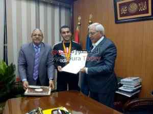 كرم الدكتور كمال شاروبيم محافظ الدقهلية ، مساء اليوم ، عبدالعزيز عاصم عبدالعزيز متحدي الإعاقه بمناسبة فوزه ببطولة العالم للكاراتيه التي أقيمت مؤخرا بمدينة مدريد بأسبانيا بإهداءه شهادة تقدير .