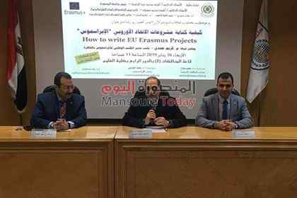 نظم مكتب العلاقات الدولية بجامعة المنصورة بالتعاون مع المكتب الوطني للإيراسموس بالقاهرة ورشة عمل عن كيفية كتابة المشروعات الأوروبية بكلية العلوم تحت رعاية السيد أ.د/ أشرف عبد الباسط رئيس الجامعة وريادة أ.د. أشرف سويلم نائب رئيس الجامعة للدراسات العليا والبحوث و بحضور الدكتور عادل جنيدي عميد كلية العلوم، الدكتور أسامة العيان وكيل كلية العلوم للدراسات العليا والبحوث، أ.د. أحمد يحيى عبيد وكيل كلية التجارة للدراسات العليا والبحوث، الدكتور رزق مصطفى وكيل كلية العلوم لخدمة المجتمع وتنمية البيئة، أ.د. محمد صلاح أستاذ الفيزياء ومدير مكتب العلاقات الدولية، الدكتور محمد العايدي أستاذ بكلية الزراعة ومنسق برنامج الإيراسموس بجامعة المنصورة.