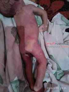وعلي الفور انتقل ضباط المركز الي موقع البلاغ وتبين أن الطفل عليه آثار تعذيب وعلامات حول رقبته وظهره وملقي علي فراشه،