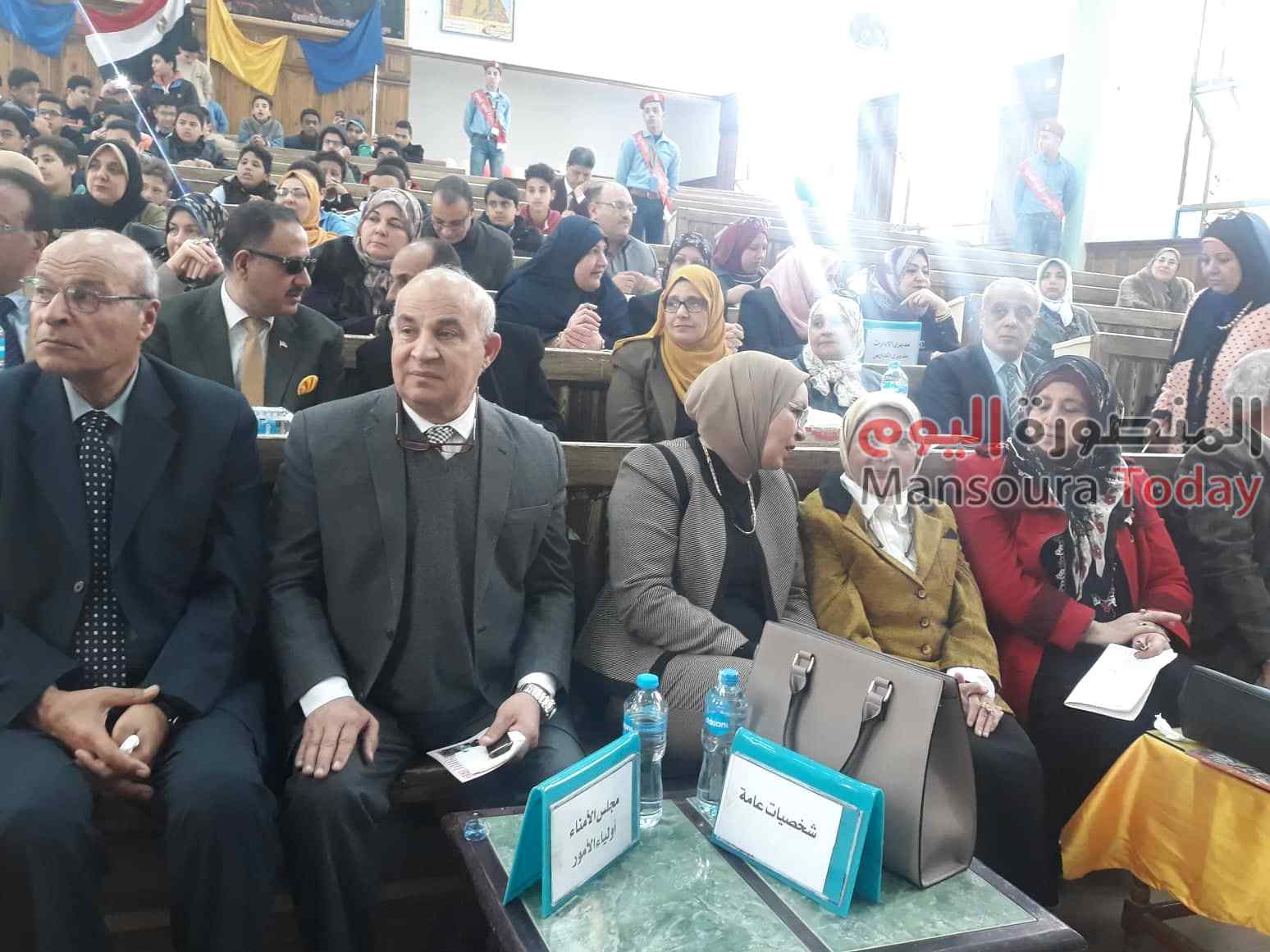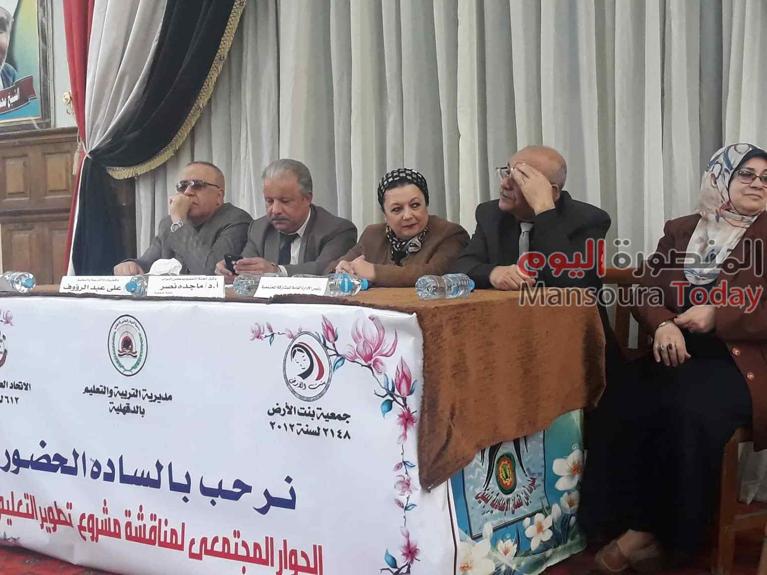 نظمت جمعية بنت الارض بالمنصورة والاتحاد العام لنساء مصر اليوم ندوة بعنوان دور المجتمع فى مناقشة تطوير التعليم بمصر فى مسرح مدرسة ابن لقمان الاعدادية بالمنصورة بحضور الدكتورة ماجدة نصر وكيل لجنة التعليم بمجلس النواب و دكتورة فرحة الشناوى والنائب نبيل الجمل والنائب أحمد الشرقاوى و نخبة من مديرى الادارات والمدارس.