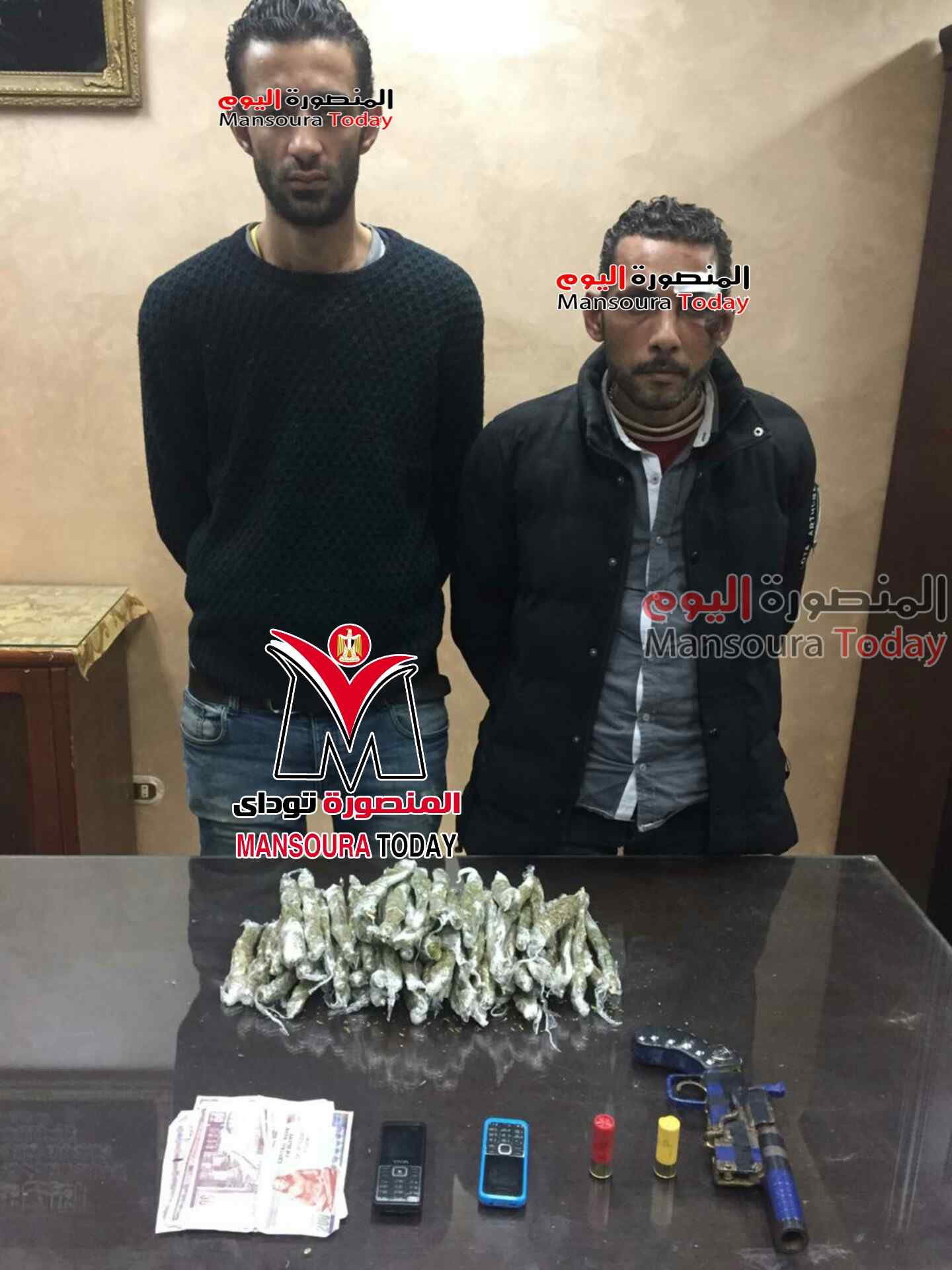 ساهر ح .ف . 39 سنة عاطل ومقيم شارع القدس الشريف توريل الجديدة دائرة قسم ثاني المنصورة ، وابراهيم رضا ا. م. 29 سنة عاطل ومقيم شارع محمد فتحي دائرة قسم أول المنصورة ، وذلك بعد ورود معلومات بقيام المتهمان بالاتجار بالمواد المخدرة وبالتحريات أكدت صحة ما ورد من معلومات ، وتم إعداد عدد من الأكمنة الثابتة والمتحركة وتم القاء القبض عليهم وبحوزتهم عدد من لفافات لنبات البانجو المخدر كبيرة الحجم ، سلاح ناري عبارة عن فرد خرطوش ، وعدد 2 طلقة خاصة بالسلاح المضبوط ، وعدد 2 هاتف محمول ، ومبلغ نقدي من المال .