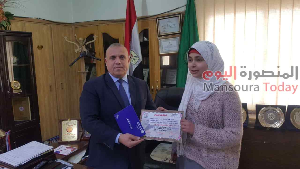 كرم ، اليوم ، على عبد الرؤوف وكيل وزارة التربية والتعليم بالدقهلية الطالبة ريم أحمد محمد الحسيني بالصف الثالث الثانوى بمدرسة الجمالية الثانوية بنات لفوزها بالمركز الأول علي مستوي الجمهورية ، فى مسابقة الإلقاء الشعرى والتحدث بالفصحى وتعميق النحو تقديرا لما بذلته من جهد .