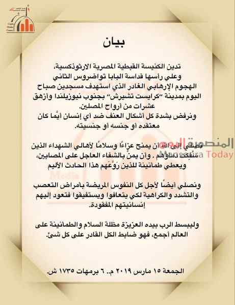 كما أدانت الكنيسة القبطية الارثوذكسية، وعلي رأسها قداسة البابا تواضروس الثاني الهجوم الإرهابي الغادر الذي استهدف مسجدين صباح ،اليوم الجمعة، بمدينة “كرايست تشيرش” بجنوب نيوزيلندا وأزهق عشرات من أرواح المصلين.