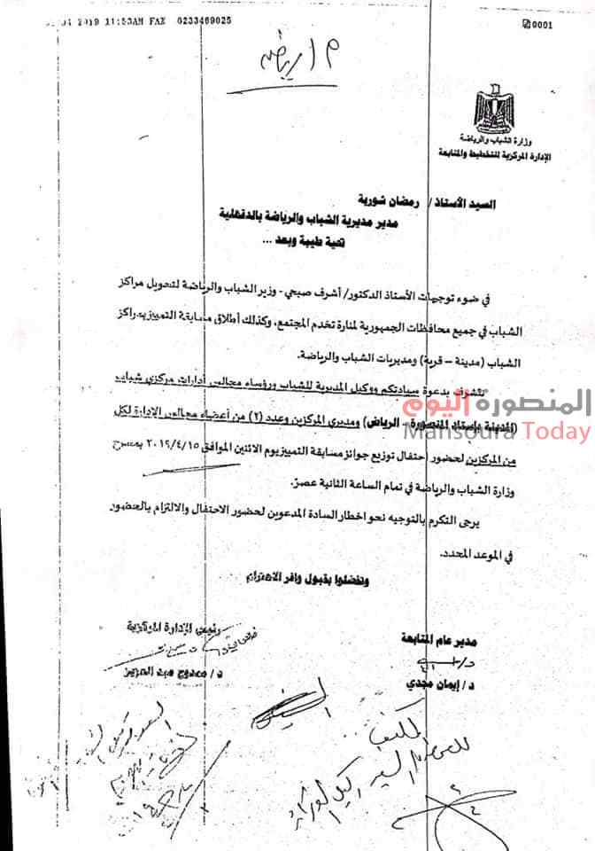 ومن المقرر إقامة حفل توزيع الجوائز، في مسرح وزارة الشباب والرياضة، يوم الأثنين الموافق 15 من ابريل الحالي، وذلك بحضور ممثلي مجلس إدارة مركزي شباب المدينة باستاد المنصورة والرياض.