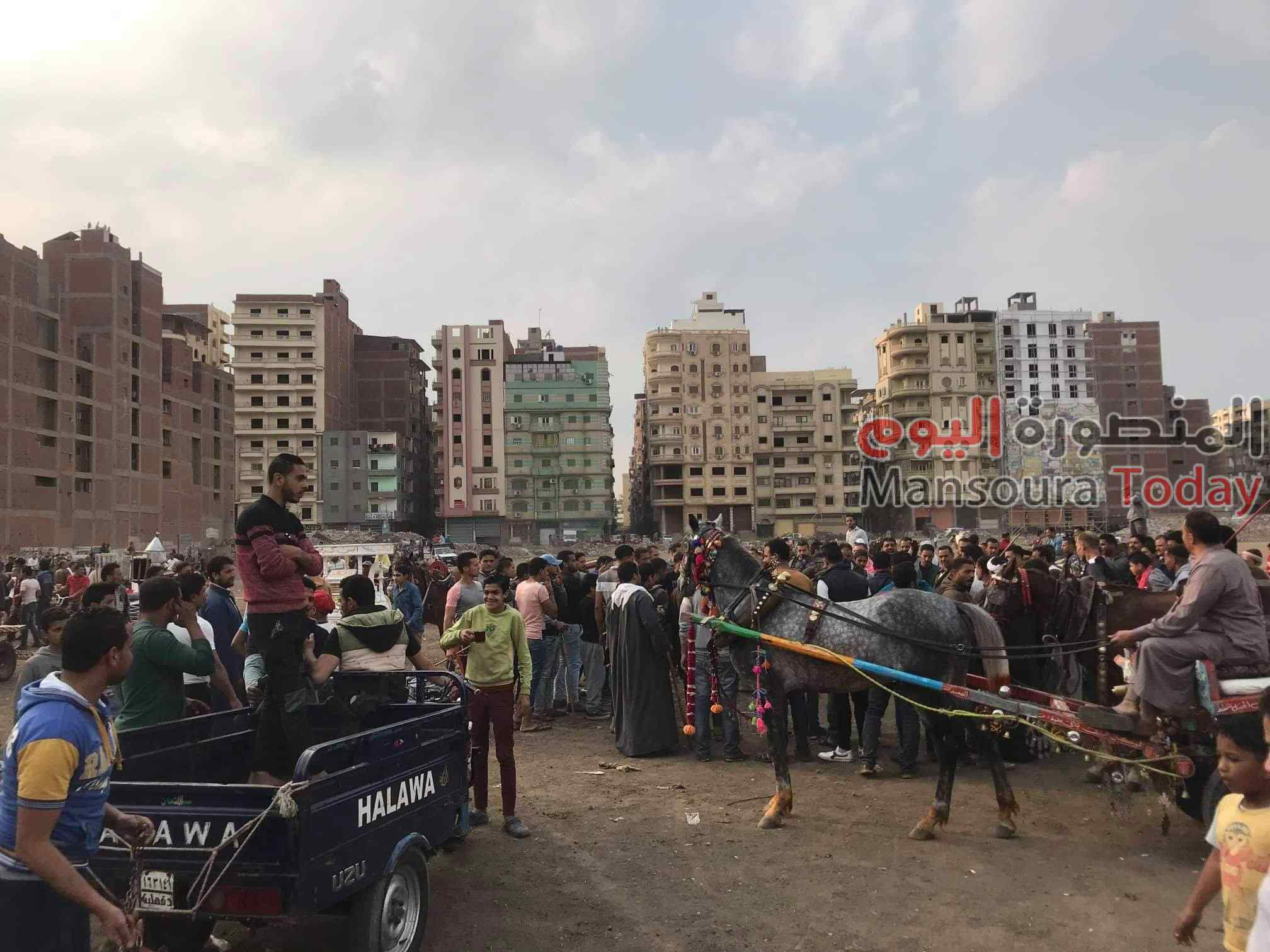 ساحة كبيرة تبلغ مساحتها اكثر من 10أفدنة ولا يسمح لاحد بالدخول اليها سوى من يملك حصان بعربة ليبدأ الرهان على الحصان الأقوى ويشترك فيه العشرات من أصحاب العربات الكارو من جميع قري محافظة الدقهلية