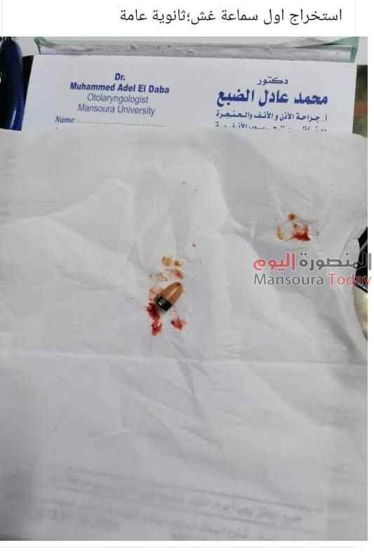 اجري الدكتور محمد عادل الضبع، أخصائي جراحة الأنف والأذن والحنجرة، عملية إستخراج سماعة دقيقة من أذن طالب بالثانوية العامة، بعد أن انزلقت داخل أذنه بعدما قام بوضعها خلال امتحان مادة اللغة العربية، مما تسبب له في ألم شديد. وقال الدكتور محمد عادل الضبع ان الطالب حاول إخفاء السماعة من المراقب داخل لجنة امتحانات في شربين بمحافظة الدقهلية، فانزلقت إلي داخل أذنه وتسببت له في ألم شديد، ووش وطنين مستمر بالأذن وأضاف أن السماعة لصغر حجمها انزلقت في الأذن وتم إجراء عملية صغير ببنج موضع لإخراجها” إلا أنها تسببت له في التهاب داخل الأذن ويحتاج إلي علاج لفترة اسبوعين حتى تعود الأذن كما كانت وبالطبع الألام تستمر معه في ايام الامتحانات القادمة وأشار إلي أنني عندما سألت الطالب عنها قال أنه اشتراها من موقع خارج مصر علي النت يعرض تلك السماعات واشترتها بالفيزا كارت بمبلغ 1700 جنيه، وأصر علي أن يأخذها معها مرة أخري بعد استخرجتها ، فطلبت تصويرها وعليها أثار الدماء وتوثيق الحدث وتوجية رسالة الي الطلاب بعدم استخدام تلك السمعات لخطورة استعملها وتسببها في العديد من المشاكل الصحية وذلك لانها جسم معدني غريب وبه بطارية