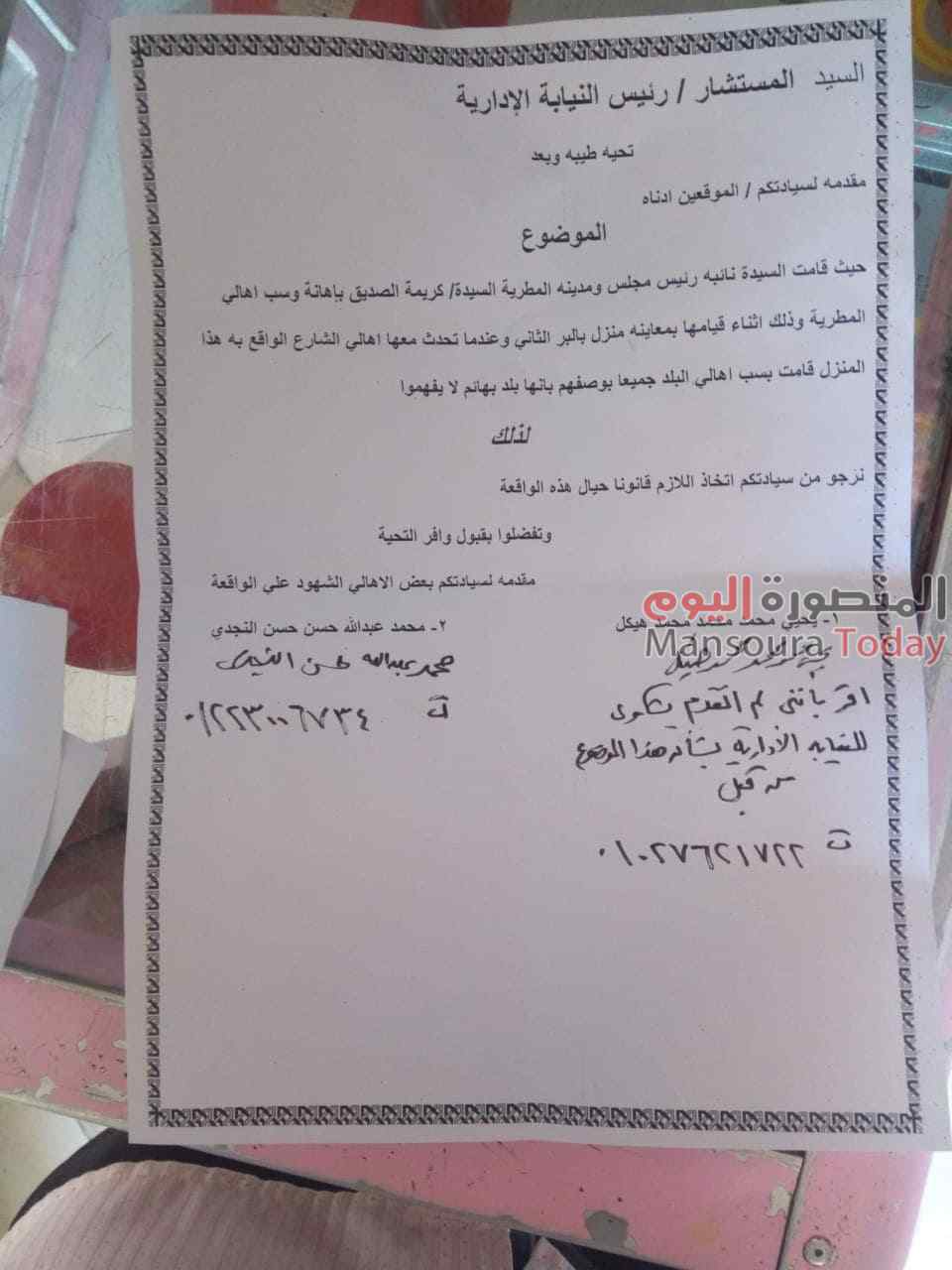 أجتاحت حالة من الغضب بين مواطنى مدينة المطرية بسبب ما نسب للسيدة/ كريمه صديق نائبه رئيس مركز ومدينه المطريه بالدقهلية من قيامها بسب وقذف مدينه المطريه امام أهالى المدينة ووصف الاهالى بالبهائم اثناء توقيفها بناء احد المنازل في موقف اغضب أهالى المدينه. وتحدث عادل ابراهيم كيف تقوم نائبة رئيس مجلس المدينة بأهانه المدينه التى رحبت بها واستقبلها اهلها فهل هذا رد الجميل منها لمدينه المطريه المعروفه بتاريخها ورجالها العظماء لذلك . وقد تقدم الأهالى بشكوى إلى النيابه الاداريه تحمل رقم 1407 بتاريخ 4 يوليو 2019 تجاه هذه الواقعه وناشد الاهالى محافظ الدقهلية من سيادتكم تحويل البلاغ للتحقيق واتخاذ كافه الإجراءات القانونية تجاه ما حدث من السيده نائبة المركز ضد أهالى المطريه.
