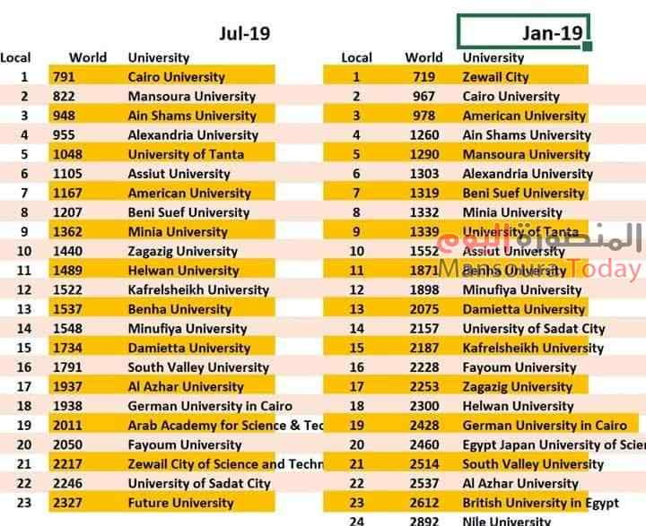 وقد تقدمت الجامعة في الترتيب السابق بإعلان التصنيف في النصف الأول يناير 2019 على مستوى الجامعات على مستوى الجامعات الحكومية محليا وعالميا حيث احتلت الجامعة المركز الثالث محليا والمركز رقم “1350” على مستوى العالم.