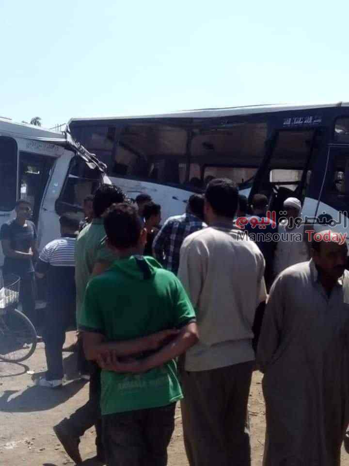 شهدت قرية كفر علام التابعة لمركز منية النصر بمحافظة الدقهلية حادث تصادم أتوبيسين لنقل الركاب وسياره ربع نقل نتيجة تسابق الأتوبيسين علي الطريق،