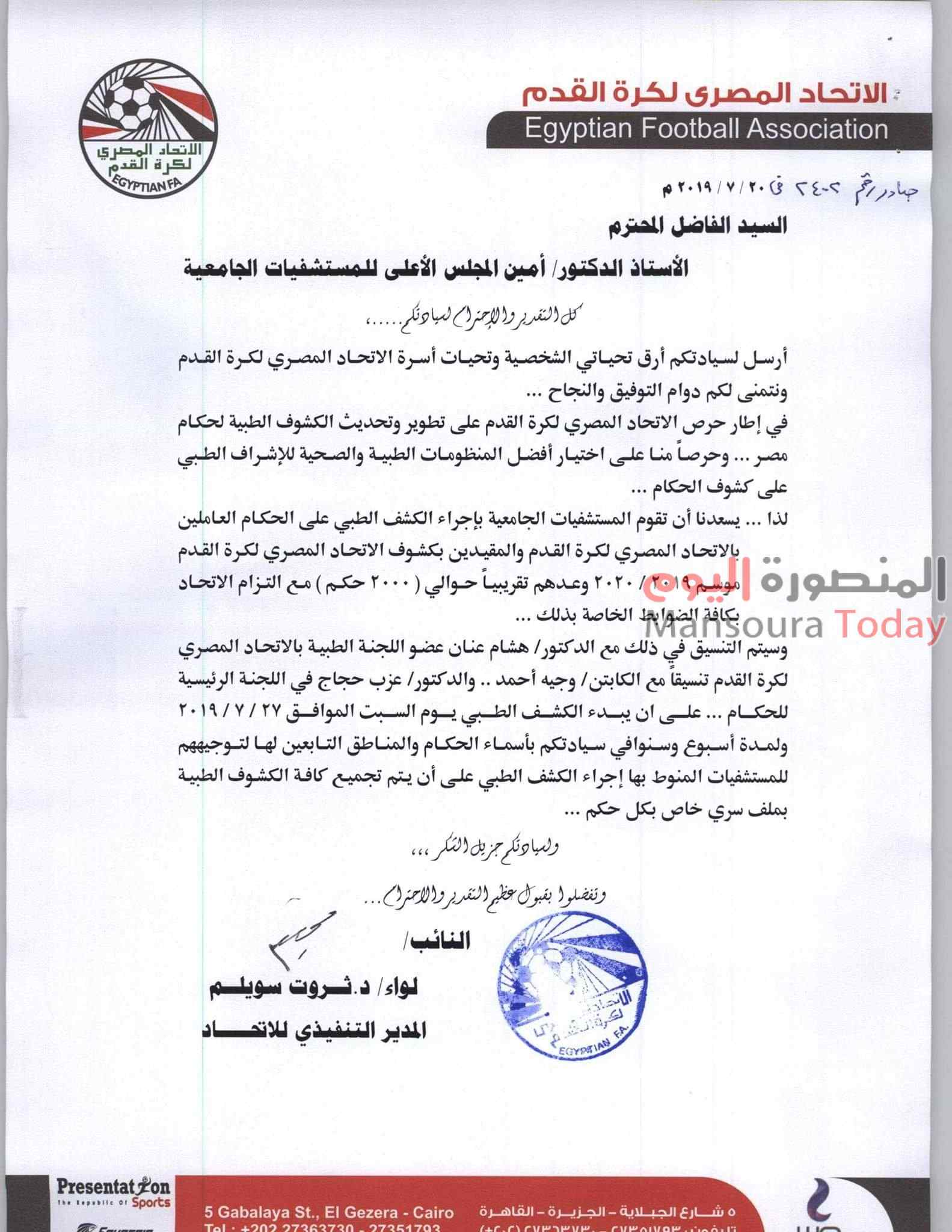 استمرت اليوم الثلاثاء عمليات الكشف الطبي لحكام كره القدم (الدرجه الثانيه والتالثه) بمحافظة الدقهلية ودمياط بمستشفى جامعة المنصورة وكذلك بالتزامن بالمستشفيات الجامعية بباقى المحافظات في ما يقرب من 20 مستشفي جامعه بناء علي طلب اتحاد الكره بالخطاب الموجه من اللواء ثروت سويلم القائم بعمل رئيس اتحاد الكره الي المجلس الاعلي للمستشفيات.