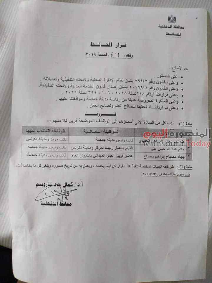 اصدر محافظ الدقهليه قرارا رقم ٤١١لسنه٢٠١٩ شمل القرار