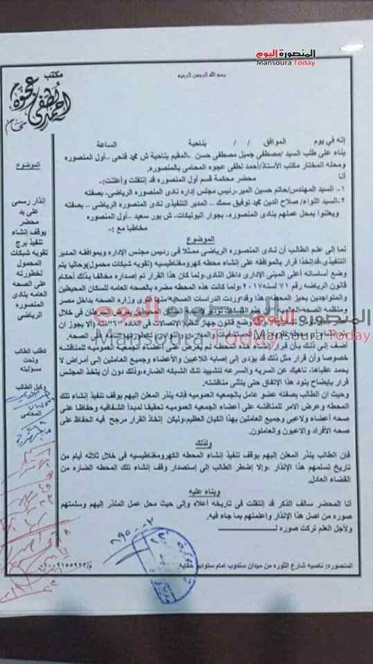 إنذار لرئيس نادي المنصورة والمدير التنفيذي لوقف انشاء برج المحمول