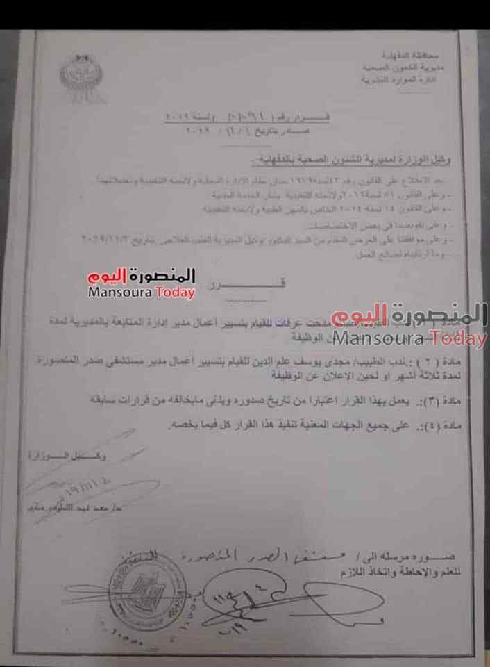 كما قرر وكيل الوزارة ندب الدكتور مجدي يوسف للقيام بتيسير أعمال مدير مستشفي الصدر بالمنصورة لمدة ثلاثة أشهر أو لحين الإعلان عن الوظيفة، ويعمل هذا القرار اعتبارا من تاريخ صدوره.