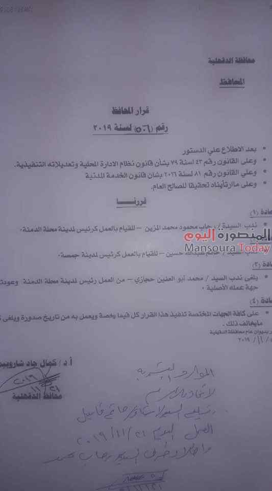 وشمل القرار ندب محمد أبو العنين رئيس مدينة محلة دمنه ، إلى ديوان عام محافظة الدقهلية.