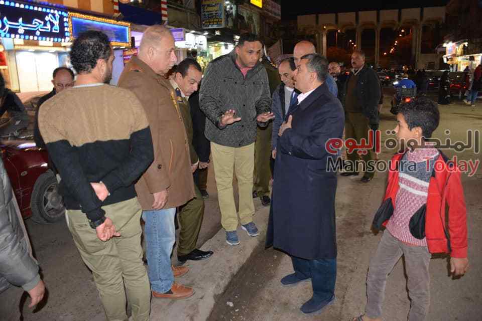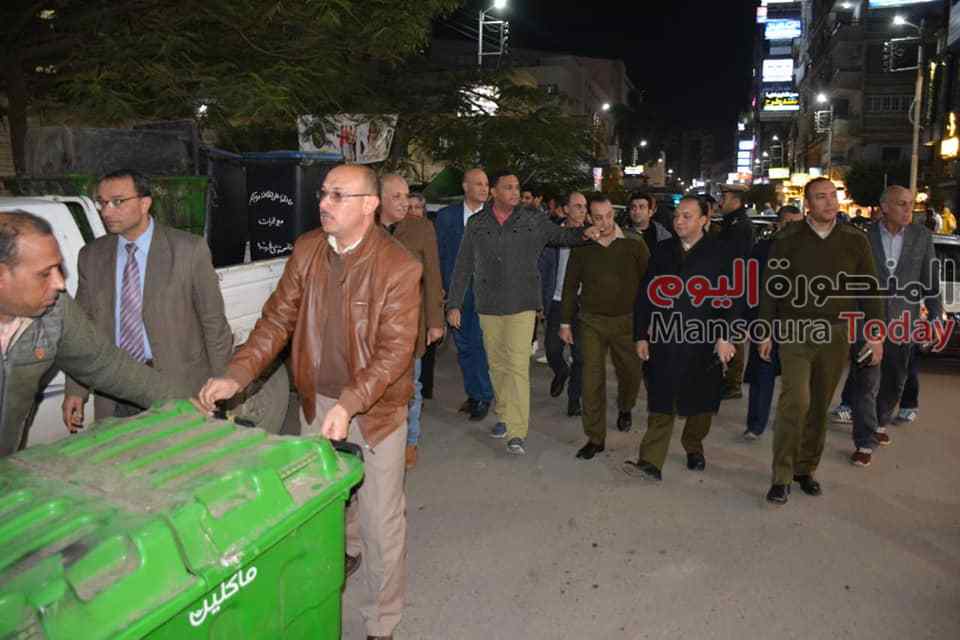 تفقد الدكتور أيمن مختار محافظ الدقهلية الليلة وسط عمال النظافة بحي شرق وغرب المنصورة للمرة الثانية خلال يومين عددا من شوارع المنصورة.
