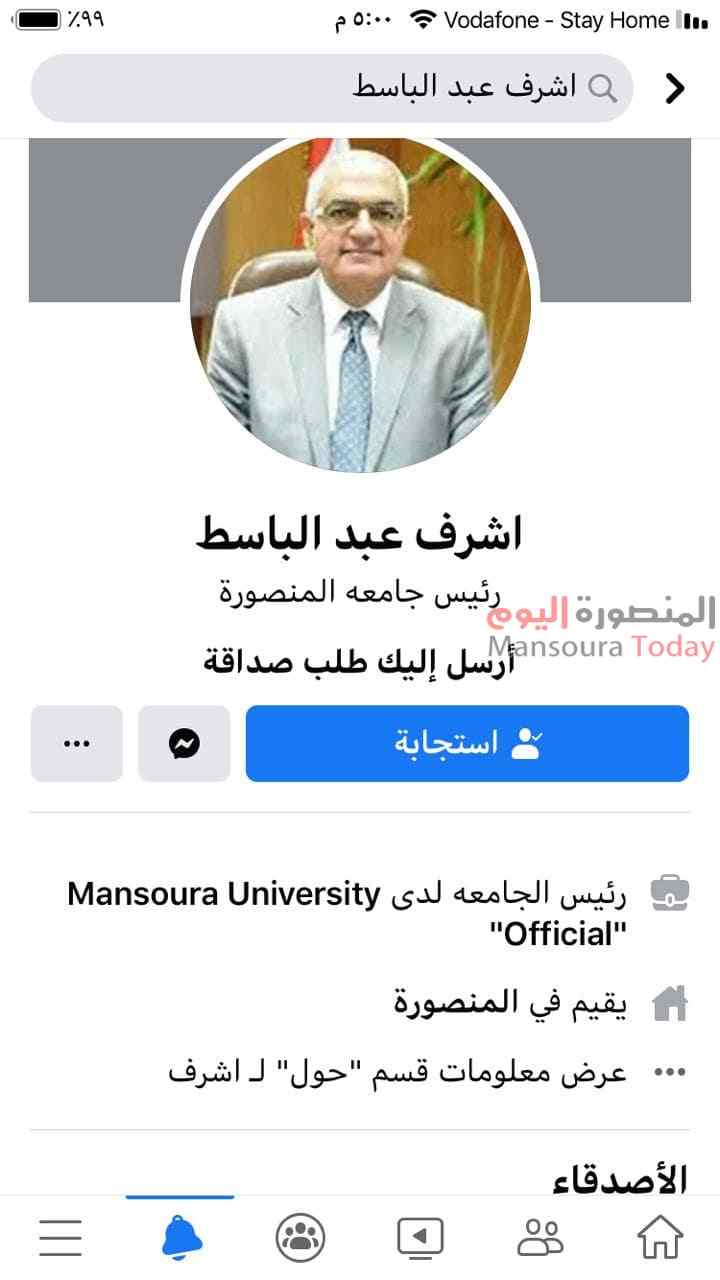 (تحذر جامعة المنصورة جميع منتسبي الجامعة من وجود هكر يستخدم حساب مزيف باسم الأستاذ الدكتور أشرف عبد الباسط رئيس جامعة المنصورة.