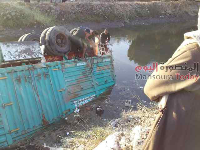 انقلبت مقطورة داخل ترعة علي طريق ميت غمر ، في محافظة الدقهلية.