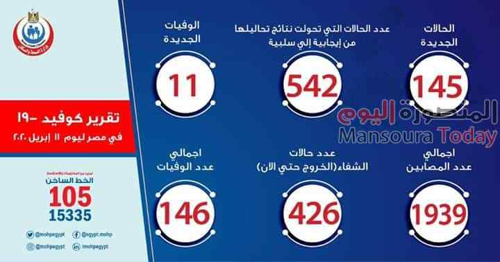وذكر مجاهد أن إجمالي العدد الذي تم تسجيله في مصر بفيروس كورونا المستجد حتى اليوم، السبت، هو 1939 حالة من ضمنهم 426 حالة تم شفاؤها وخرجت من مستشفى العزل، و 146 حالة وفاة.