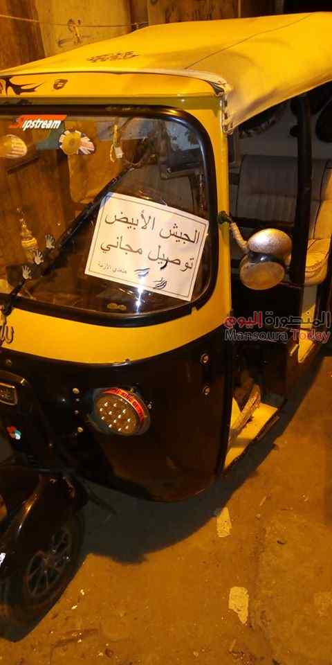 قام سائق توك توك يدعي أسامة مرعي من مدينة الجمالية بمحافظة الدقهلية، بتعليق لافتة على زجاج التوتوك الخاص مكتوب عليها، ” للجيش الأبيض.. الركوب مجانًا”، وبدون أي مصاريف أو أموال، على أن يقوم بتوصليهم إلى بيوتهم بدون أي تكاليف أو مبالغ مالية لدعم الجيش الأبيض في مواجهة فيروس كورونا .