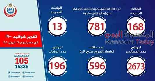 وذكر “مجاهد” أن إجمالي العدد الذي تم تسجيله في مصر بفيروس كورونا المستجد حتى اليوم الخميس، هو 2673 حالة من ضمنهم 596 حالة تم شفاؤها وخرجت من مستشفيات العزل، و196 حالة وفاة.