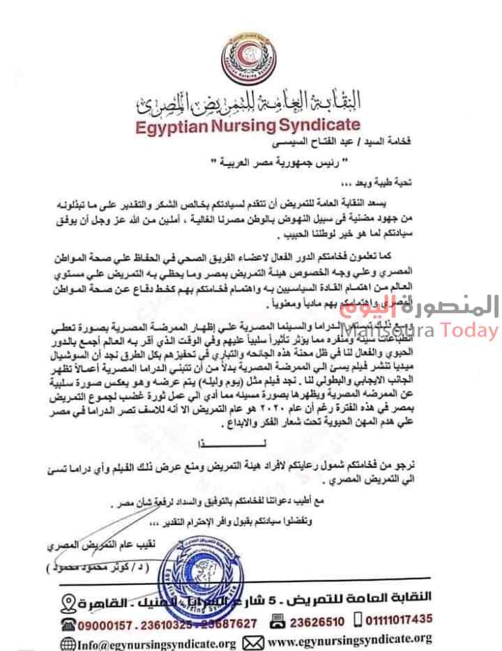 وجاء في المذكرة: “كما تعلمون بالدور الفعال لأعضاء الفريق الصحي في الحفاظ على صحة المواطن المصري وعلى وجه الخصوص هيئة التمريض بمصر وما يحظى به التمريض على مستوى العالم من اهتمام القادة السياسيين به واهتمام فخامتكم بهم كخط دفاع صحة المواطن واهتمامكم به ماديا ومعنويا”.