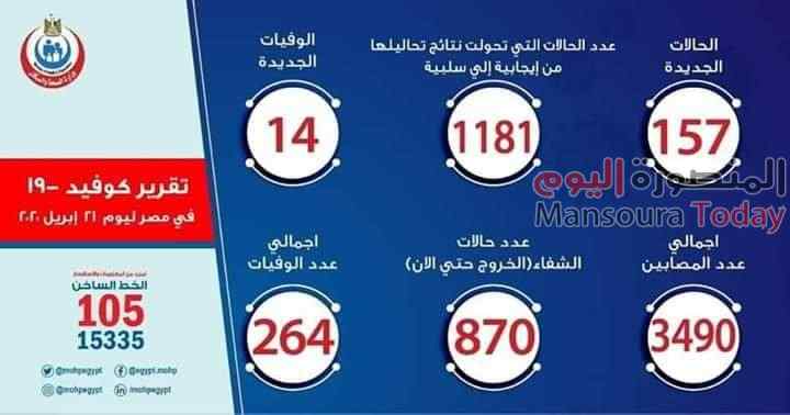 وذكر “مجاهد” أن إجمالي العدد الذي تم تسجيله في مصر بفيروس كورونا المستجد حتى اليوم، الثلاثاء، هو 3490 حالة من ضمنهم 870 حالة تم شفاؤها وخرجت من مستشفيات العزل، و 264 حالة وفاة.