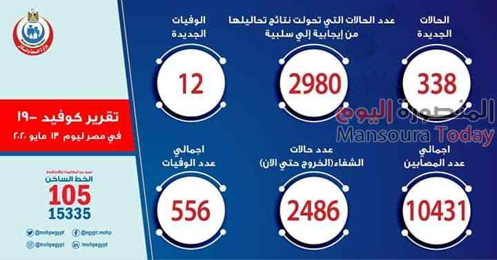 الصحة: تسجيل 338 حالة إيجابية جديدة لفيروس كورونا.. و 12 حالة وفاة