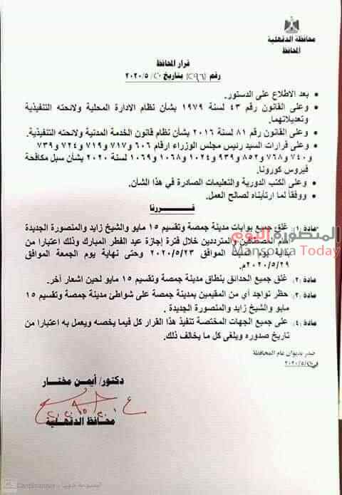 أعلن هيثم الشيخ نائب محافظ الدقهلية بالإنابة عن المحافظ قرارا بغلق جميع بوابات مدينة جمصة وبوابات تقسيم ١٥ مايو والشيخ زايد والمنصورة الجديدة وذلك خلال اجازة عيد الفطر المبارك فى الفترة من ٢٣ الى ٢٩ مايو الجارى وذلك امام المصطافين والمترددين.