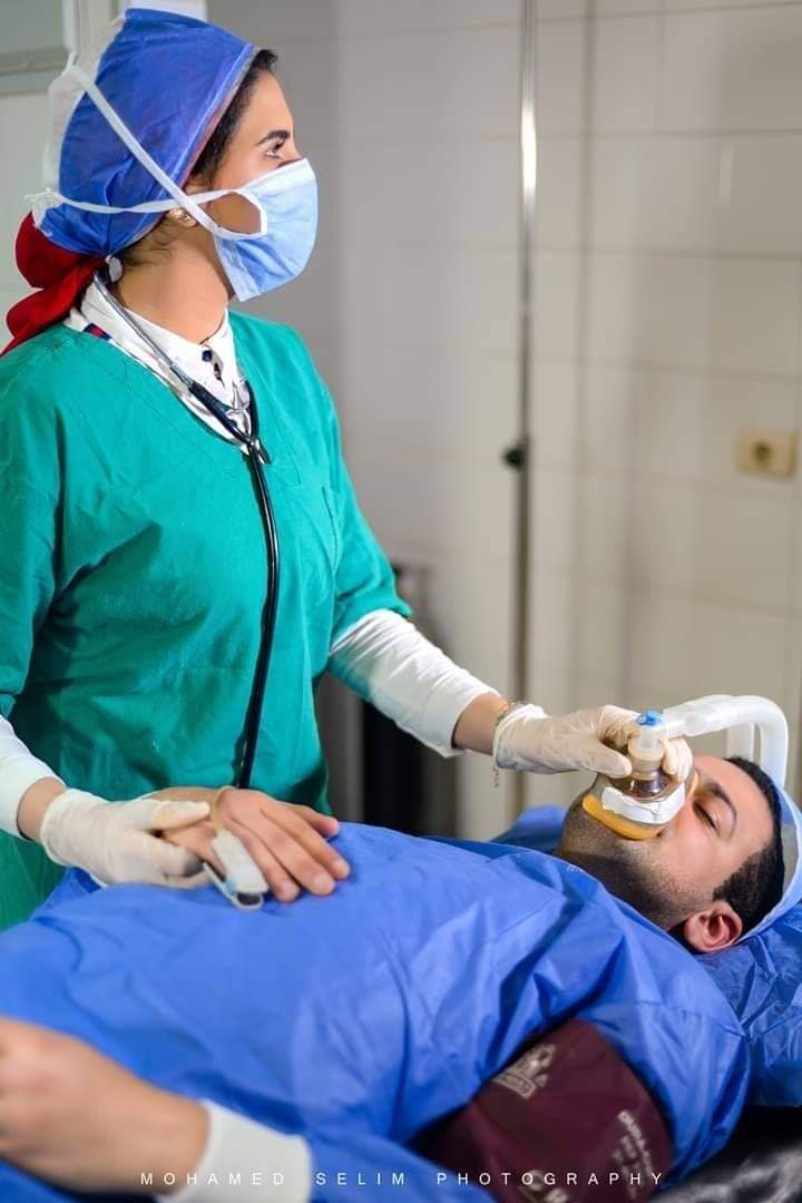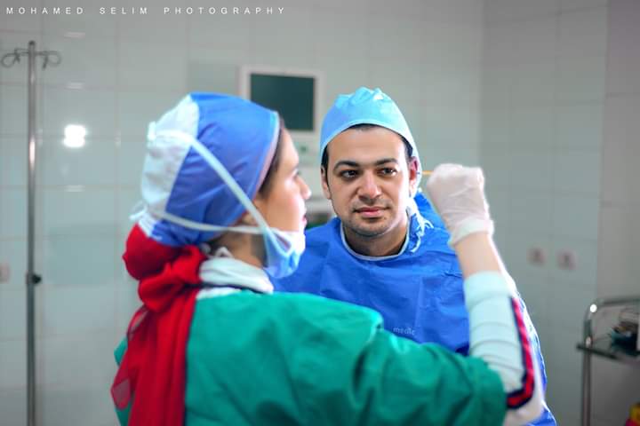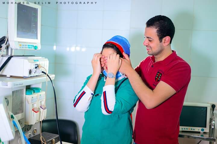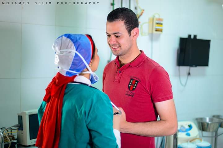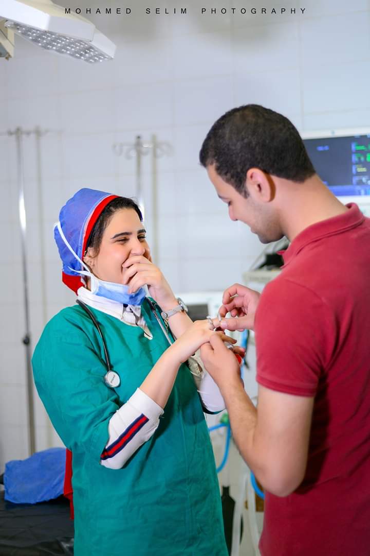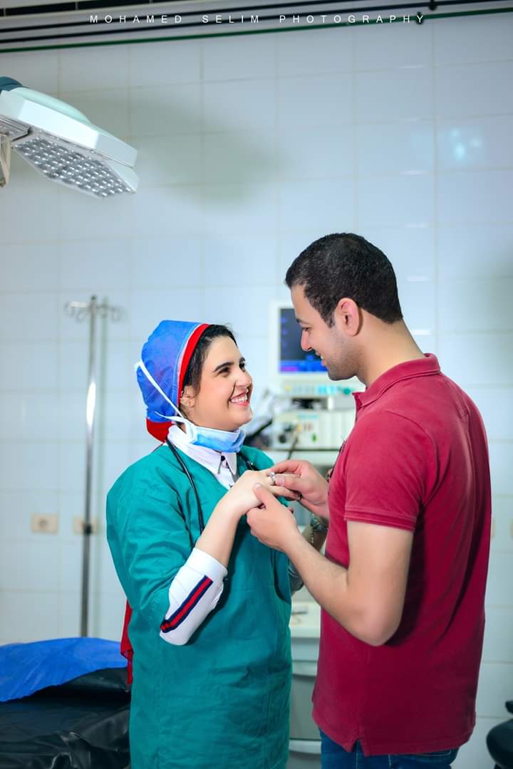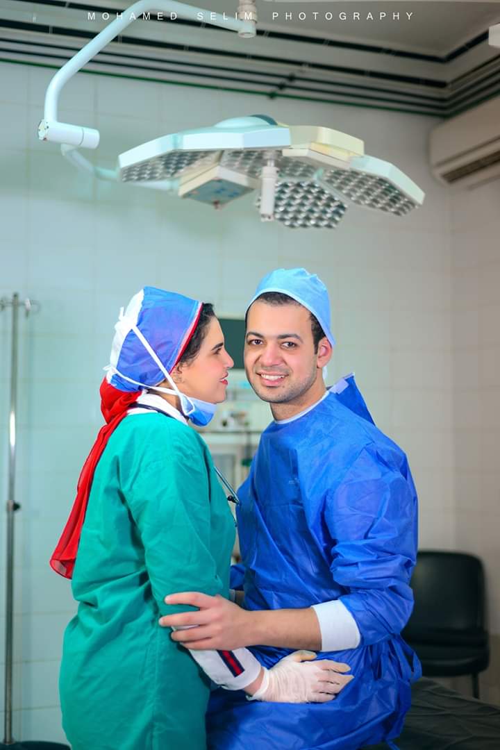 وابدع المصور محمد فهمي في توثيق مجموعة من الصور الفوتوغرافيه تظهر اجمل لحظات بين الحبيبان آية ممرضه ومحمد اداري داخل غرفة العمليات وسط الأجهزة الطبية