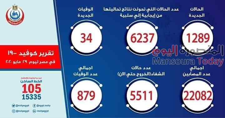 الصحة: تسجيل 1289 حالة إيجابية جديدة لفيروس كورونا.. و 34 حالة وفاة