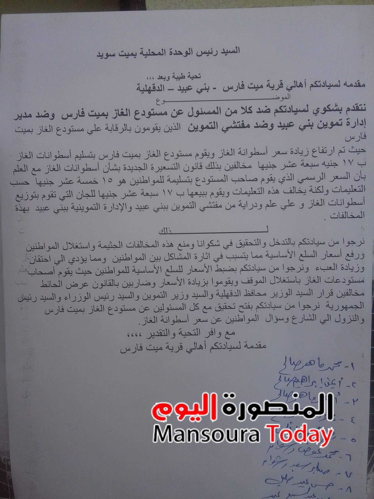 قام عدد من أهالى قرية ميت فارس اليوم بمقابلة الاستاذ السيد على منصور رئيس الوحدة المحلية بميت سويد لتقديم شكوي موقعة من الأهالي بميت فارس بخصوص ارتفاع سعر أنبوبة الغاز ومخالفة التسعيرة التي أعلنتها الحكومة واستغلال المواطنين والجشع وغياب الرقابة.