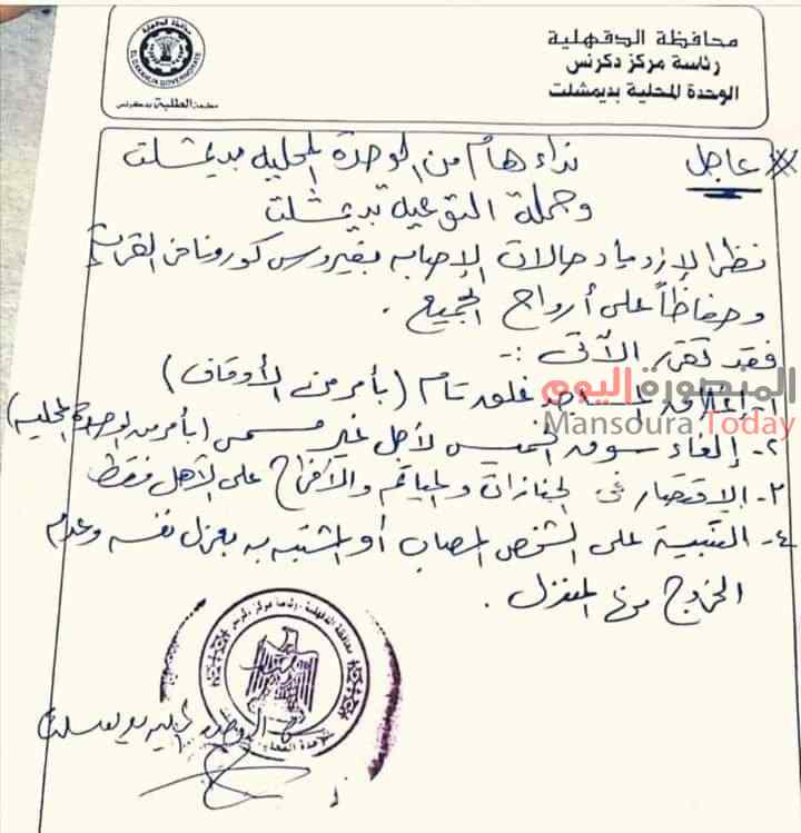 قرر الدكتور أيمن مختار محافظ الدقهلية عزل رئيس الوحدة المحلية بديمشلت بعد نشره تحذير عن وجود حالات إصابة بفيروس كورونا على غير الحقيقة ودون تحري الدقة.