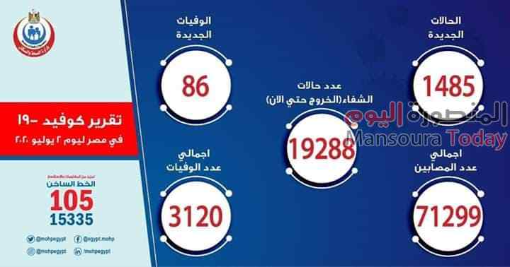 وأوضح الدكتور خالد مجاهد مستشار وزيرة الصحة والسكان لشئون الإعلام والمتحدث الرسمي للوزارة، أنه تم تسجيل 1485 حالات جديدة ثبتت إيجابية تحاليلها معمليًا للفيروس، وذلك ضمن إجراءات الترصد والتقصي والفحوصات اللازمة التي تُجريها الوزارة وفقًا لإرشادات منظمة الصحة العالمية، لافتًا إلى وفاة 86 حالة جديدة.