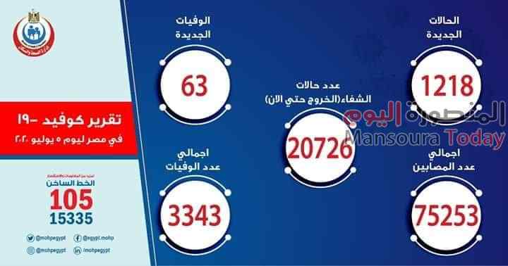 وأوضح الدكتور خالد مجاهد مستشار وزيرة الصحة والسكان لشئون الإعلام والمتحدث الرسمي للوزارة، أنه تم تسجيل 1218 حالة جديدة ثبتت إيجابية تحاليلها معمليًا للفيروس، وذلك ضمن إجراءات الترصد والتقصي والفحوصات اللازمة التي تُجريها الوزارة وفقًا لإرشادات منظمة الصحة العالمية، لافتًا إلى وفاة 63 حالة جديدة.