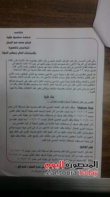 اقام مكتب محمد محمود عطيه وهيثم محمد عبدالستار المحامان بالمنصورة دعوي قضائية بإلغاء نتائج مسابقة كأس مصر الموسم الماضي 2016/2015 وما يترتب عليه من تسميه البطل (الزمالك )واشتراكه فى مسابقه افريقيا وعدم صرف دعم له من اتحاد الكورة وارجاع الكأس للأتحاد المصرى.