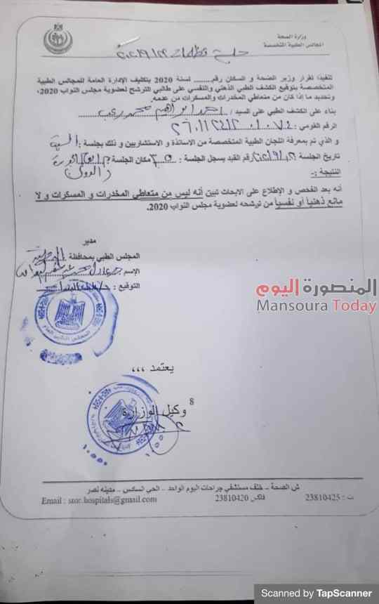 أنه بعد الفحص و الإطلاع على الأبحاث تبين أنه ليس من متعاطي المخدرات و المسكرات و لامانع ذهنية أو نفسيا من ترشحه لعضوية مجلس النواب 2020.