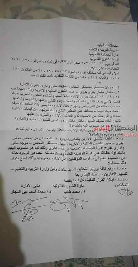 وقررت الشئون القانونية إلغاء تكليفهما ومجازاتهما بخصم 3 أيام من راتبهما وإخطار تنسيق الإداريين بمديرية التربية والتعليم بالدقهلية باستبعادهما خارج إدارة الجمالية إلى إدارة أخرى، حفاظًا على هيبة الوظيفة العامة ومنه تكرار ذلك مستقبلا.