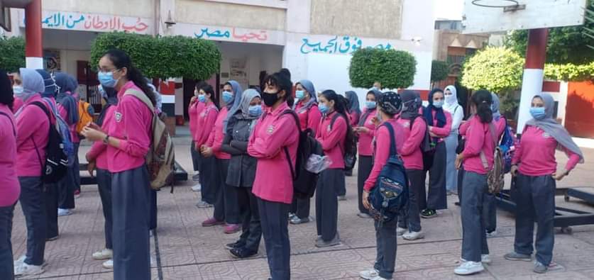 وتوافد الطلاب على مدارس قرى ومدن المحافظة فى أول أيام العام الدراسى الجديد ٢٠٢٠/ ٢٠٢١ وسط سعادة الأطفال ببداية الدراسة، ومرافقة أسرهم وذويهم مرتدين الماسكات وحاملين الأدوات الإحترازية من كحول وصابون .