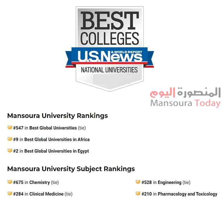 أعلن موقع U.S. News ” يو إس نيوز ” الأمريكي تصنيف الجامعات حيث جاءت جامعة المنصورة فى الترتيب الثاني على مستوى الجامعات المصرية بدرجة 48.9 بعد جامعة القاهرة بدرجة 53.2 ، وصنفت في المرتبة رقم 9 في ترتيب الجامعات الأفريقية و 547 على المستوى العالمي بتقدم 116 مركز عن العام الماضى . الجدير بالذكر أن التصنيف يعتمد على أداء البحث العلمي في هذه المواضيع وذلك باستخدام مجموعة متنوعة من المؤشرات الببليومترية bibliometrics وهى عبارة عن مجموعة من الأساليب الكمية لتحليل المؤلفات الأكاديمية و المنشورات الجامعية و تتضمن اساليب لتحليل الاقتباسات ( حجم المراجع المستخدمة) وتحليل المحتوى بشكل عام .