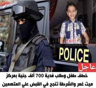 تلقى اللواء رأفت عبد الباعث مدير أمن الدقهلية اخطارا بورود بلاغ لضباط مركز شرطة ميت غمر من المدعو علي محمود عبد الفتاح 33 سنة أمين شرطة نظام بسجن قنا العمومي ، ومقيم قرية ” أتميدة ” دائرة المركز ، بعدم عودة نجله المدعو آدم علي محمود عبد الفتاح 8 سنوات طالب بالصف الثائي الابتدائي بمدرسة أتميدة للتعليم الأساسي للمنزل عقب انتهاء اليوم الدراسي، وأثناء قيامه بالبحث عنه ورد اتصال تليفوني لشقيقه المدعوة نورا محمود عبد الفتاح 38 سنة ربة منزل ، ومقيمة ” شبرا الخيمة ” القليوبية، علي هاتفها من زوج والدتهما المدعو محمد محمد 45 سنة نجار مسلح ، ومقيم بذات العنوان، أخبرها أن الطفل طرفه ولن يقوم باعادته الا بعد قيام والدتها ” زوجته ” ببيع المنزل وارسال ثمنه له).