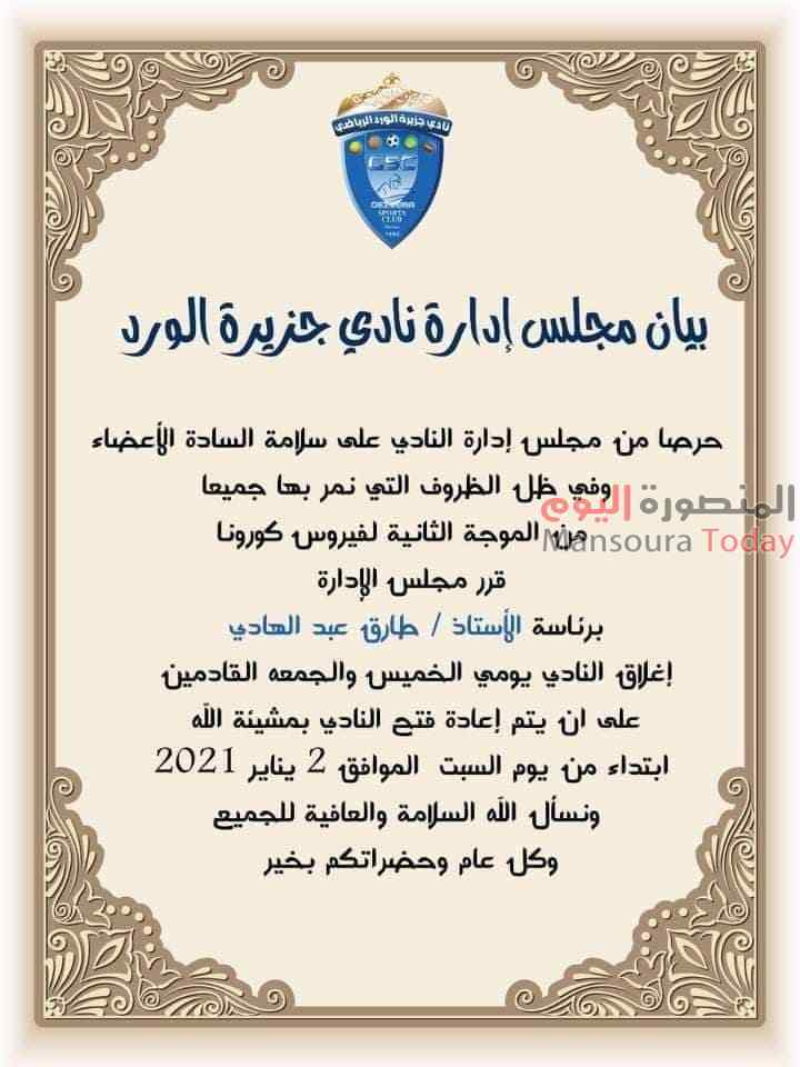 وفي نفس السباق قرر مجلس ادارة نادي جزيرة الورد الرياضي بالمنصورة أغلق النادي يومي الخميس والجمعة القادمين لنفس الأسباب السالف ذكرها.