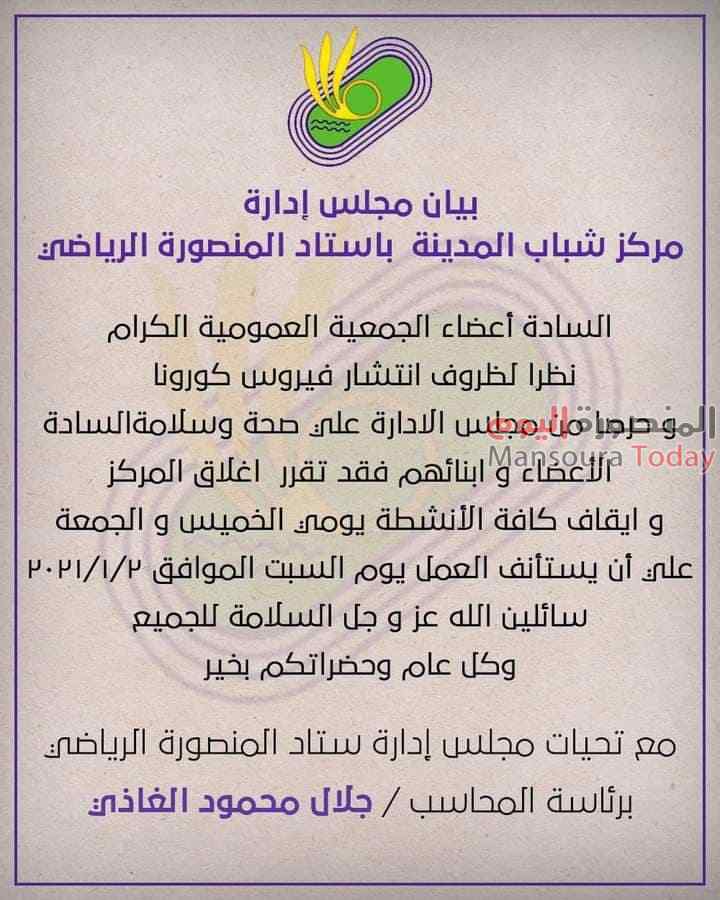 قرر مجلس إدارة استاد المنصورة الرياضي برئاسة المحاسب جلال الغازى إغلاق الاستاد ، يومي الخميس والجمعة القادمين، في ظل ظروف الموجة الثانية لفيروس كورونا، على أن يتم فتح الاستاد مرة أخرى يوم السبت الثاني من يناير ٢٠٢١.