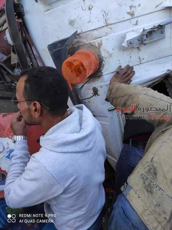 وعلي الفورانتقل ضباط المباحث وسيارة الإسعاف إلى مكان الحادث ،وتبين انقلاب السيارة النقل رقم «ط ق ص 4682»، ومقطورتها رقم «د أ ط 8675» واصطدمت بعدد 2 عمود إنارة وسلالم مسجد الفتح ثم في كشك حلويات، ونتج عن الحادث إصابة سائق السيارة ويدعى “محمد إبراهيم علي”، وصاحب الكشك “أحمد السيد اسماعيل” وتمكن رجال المرور والشرطة ورئاسة مركز المنصورة من إعادة تشغيل الطريق بعد إزالة نواتج الحفر التي سقطت في الطريق باستخدام لوادر رئاسة المركز، وتم إعادة فتح الطريق مرة أخرى فيما استمرت السيارة على حالها لحاجتها إلى ونش كبير لتحريكها من مكانها. وتحرر عن الواقعة المحضر اللازم وجار العرض على النيابة العامة.